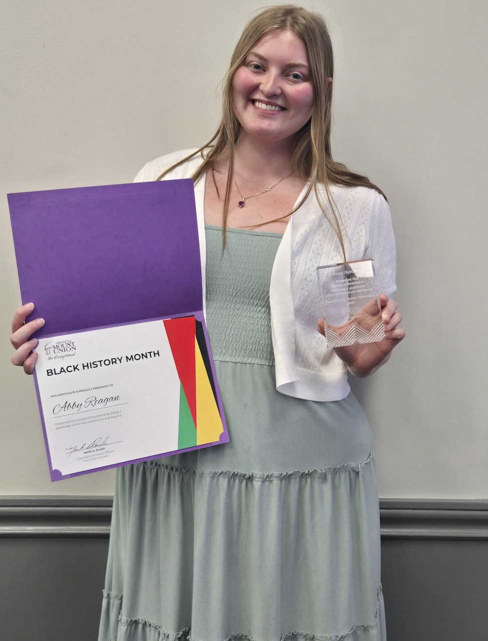 ALLIANCE- Giving back to the community and to students is at the heart of the University of Mount Union’s core values of belonging, leadership, and service. Black History Month is a time to honor those who pass on their passion for giving back in ways they can. Abby Schroeder '11, director of the Regula Center; Jeziah Farrar ’26, marketing major; and Abby Reagan ’26, primary education and intervention specialist major, were this year’s honorees at Mount Union’s Black History Month Pathfinder Lecture on Thursday, February 26.